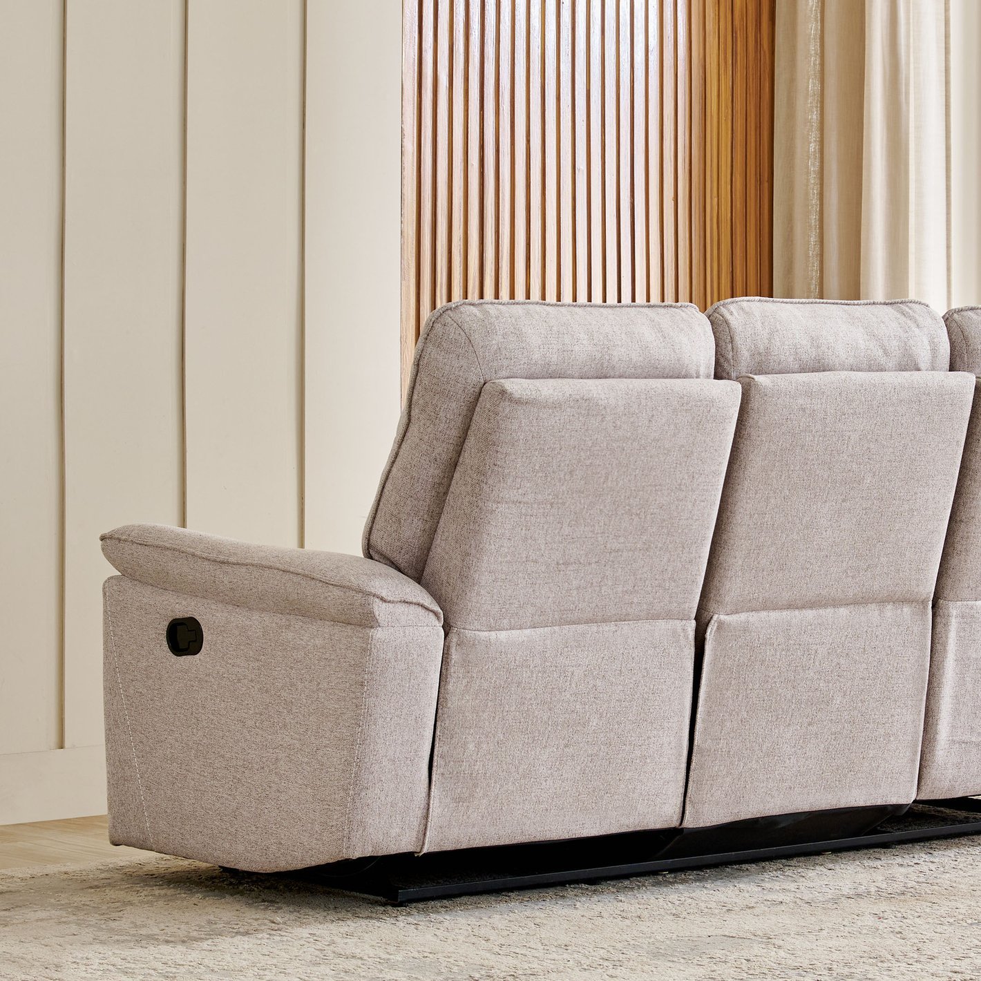 Enjoy luxury and comfort with this 3-seater manual recliner. Upholstered in breathable, durable polyester, it features a sturdy frame of pre-treated pine wood and fibreboard for stability and moisture resistance. Filled with HDR and softy foam, it offers semi-soft, comfortable seating with just the right resilience.