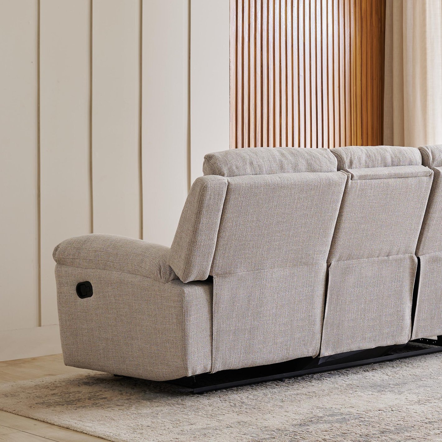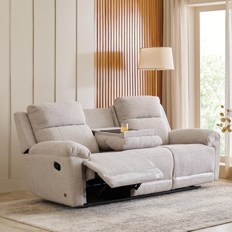 Relax in timeless comfort with this 3-seater manual recliner, built on a sturdy pine and plywood frame. Upholstered in antimicrobial and hypoallergenic polyester fabric, it features HDR PU and soft foam for semi-soft seat comfort. The drop-down table with cupholders adds practical convenience, while its sleek, antiquated design and lab-tested 25,000-cycle recline mechanism ensure durability and smooth functionality.
