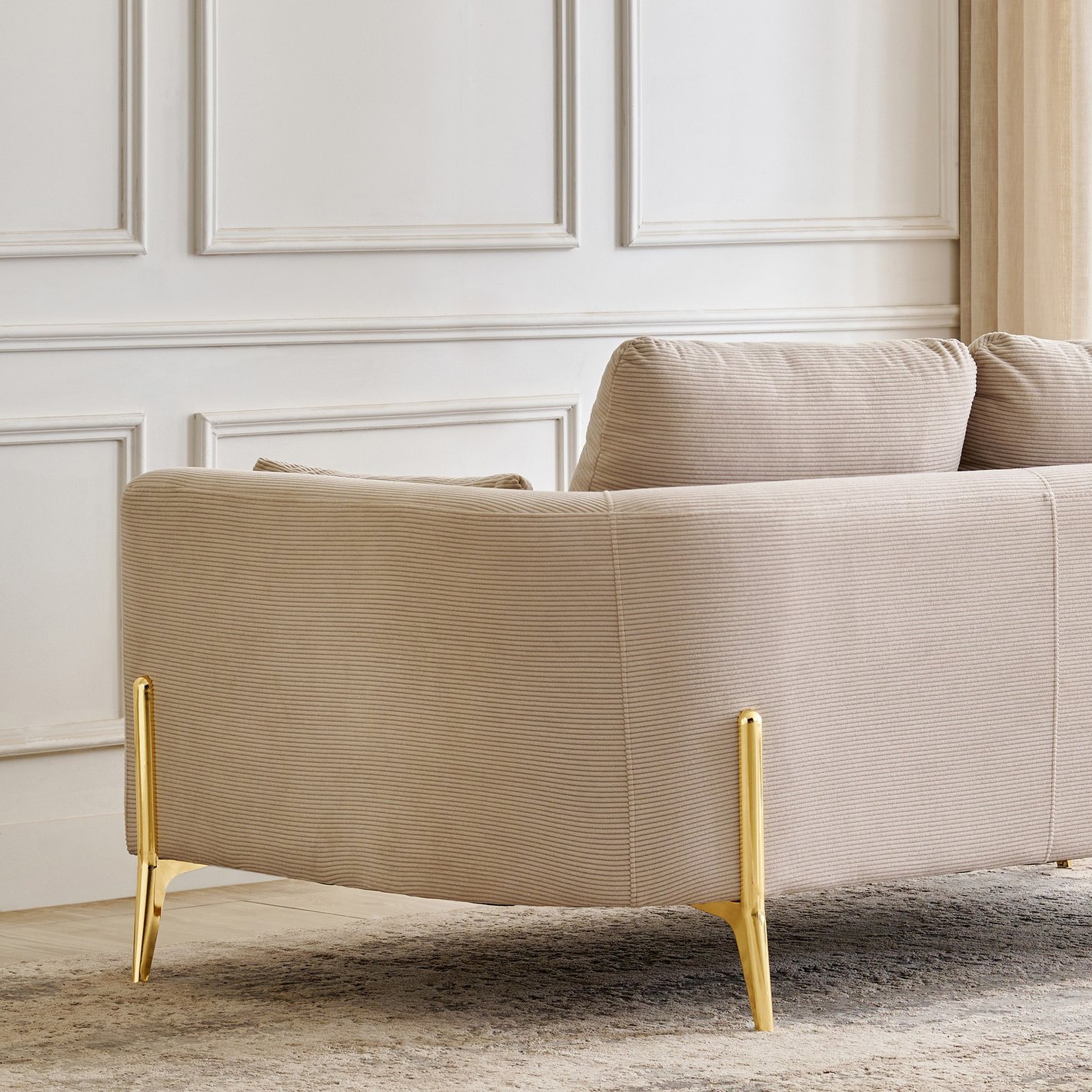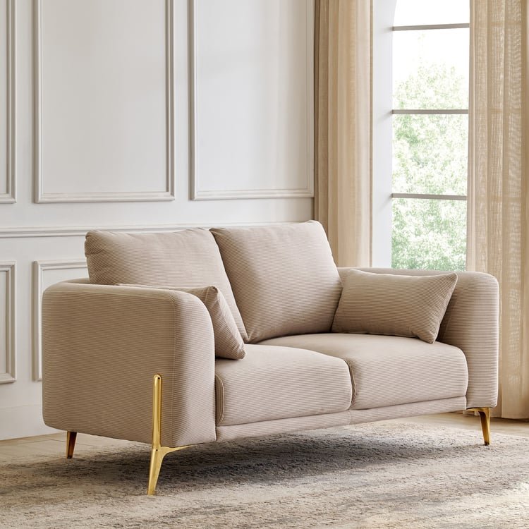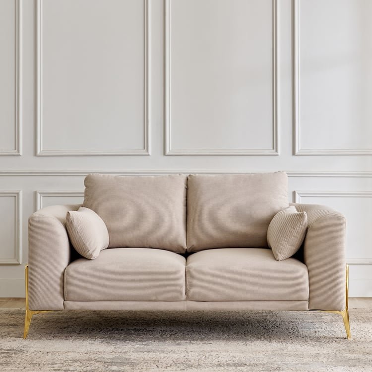 This 2-seater sofa blends timeless charm with modern comfort. Upholstered in durable, antimicrobial polyester fabric, it boasts a sturdy pine wood frame and pocket spring coils for lasting support. Broad arms, cushions, and sleek electroplated metal legs complete its stylish, contemporary look.