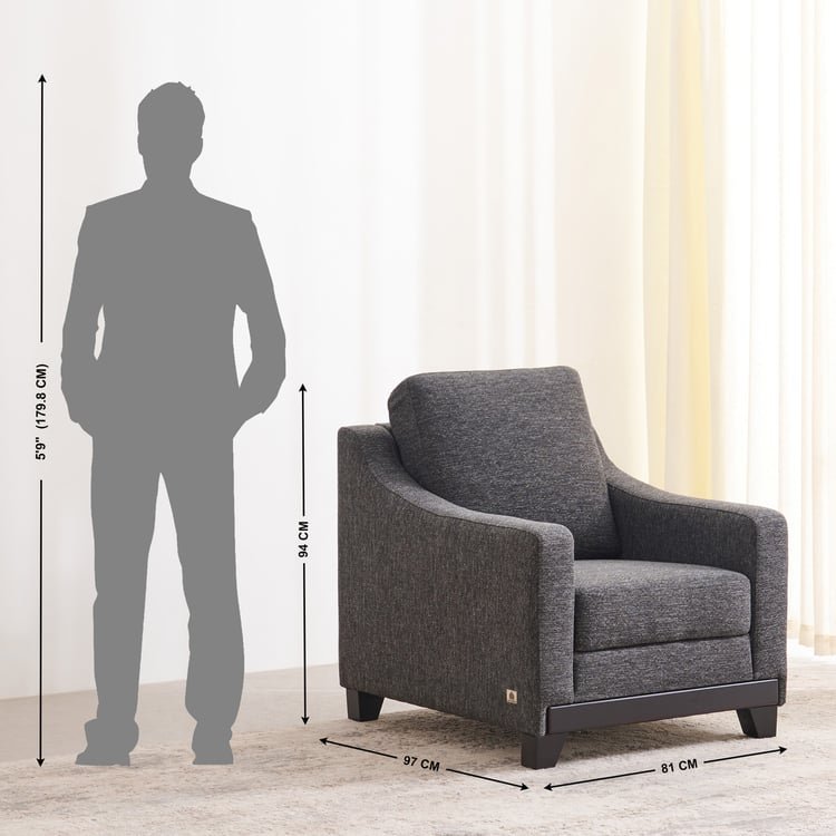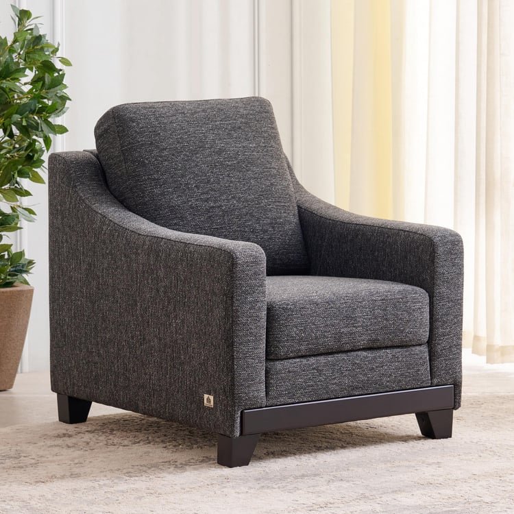 This 1-seater sofa from Home Centre is elegant and brings an element to your living room. The frame is constructed from pretreated pine wood, which is stable, elastic, lightweight, and resistant to moisture and wood infestation. For added stability, corner blocks are included to support the sofa during movement, along with a middle leg for extra support. The seat construction features full core HDR PU foam, offering firm, resilient comfort. Additionally, the sofa incorporates a webbing and zigzag spring system, utilizing 3.8mm mild steel wires with an anti-corrosive powder-coated finish. These springs are clipped to the frame with metal clamps, ensuring uniform seat comfort. This sofa is upholstered with antimicrobial and anti-allergenic polyester fabric.