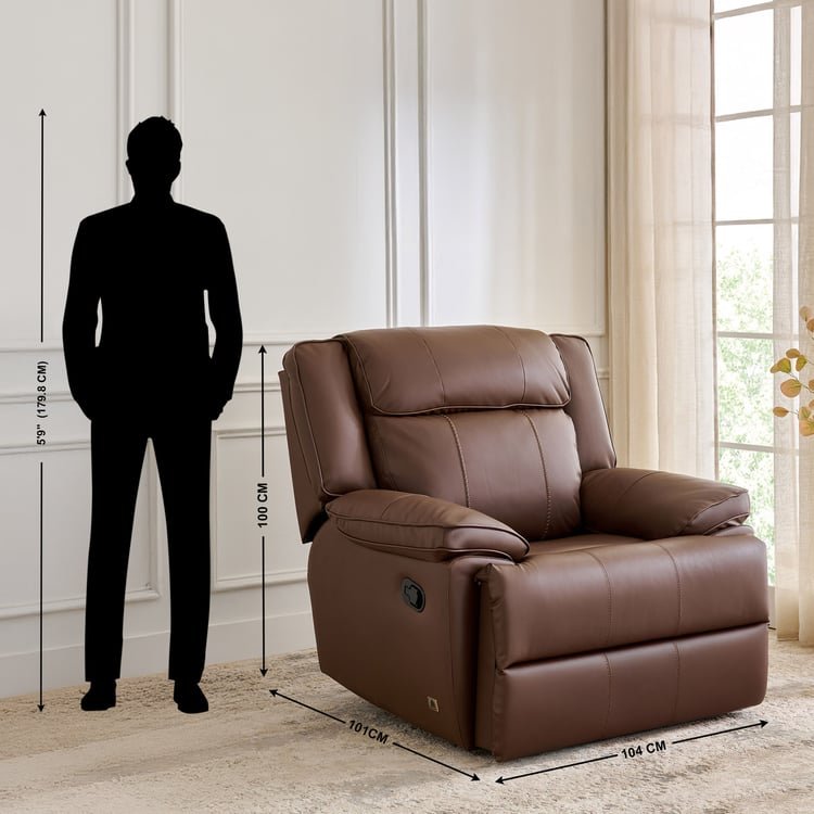 Relax in comfort with this durable 1-seater recliner offers premium comfort, elegant design, and perfect relaxation for your modern living space. Built with a sturdy pine wood frame, high-density plywood, and supportive webbing straps, it features plush HDR PU and Softy foam cushioning upholstered in easy-to-clean, spill-resistant polyurethane. The lab-certified manual recliner mechanism offers smooth, independent backrest and footrest movement, tested for up to 25,000 cycles