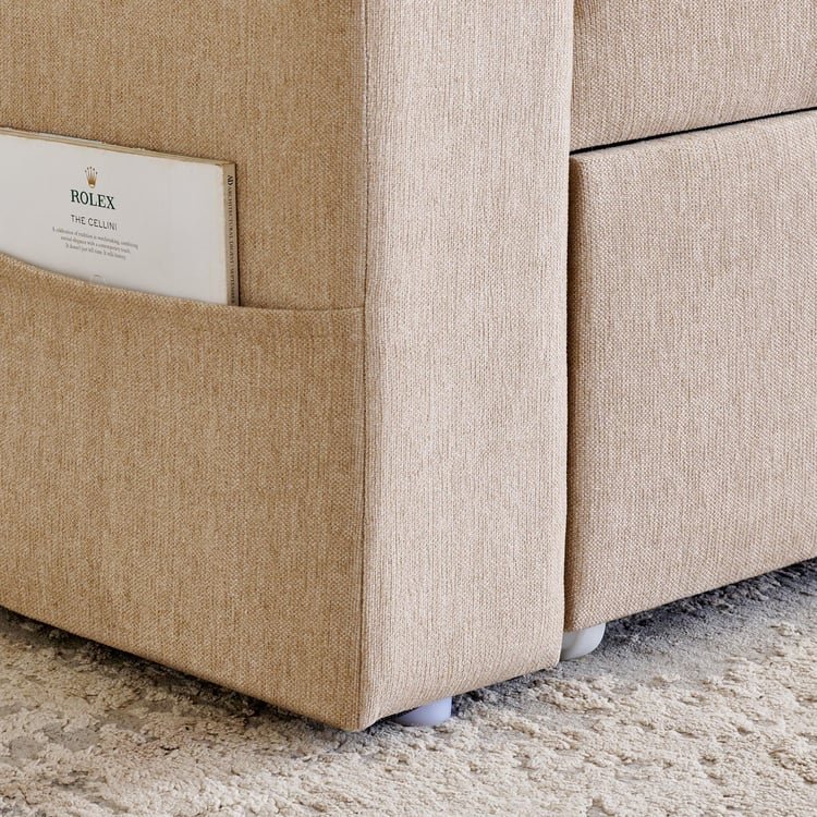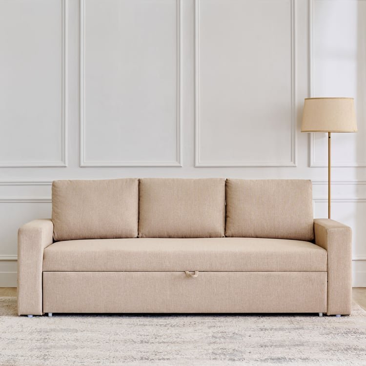 Bring home this 3-seater sofa cum bed from Home Centre, offering plush comfort and convenient storage for lounging during the day and sleeping at night. Made from pine wood, its corner blocks are positioned at right angles for enhanced stability during movement. The sofa features polyester upholstery and elastic webbing straps woven in a grid pattern. Additionally, the high-density plywood adds structural stability, while virgin PU foam provides a smooth, undulated finish. The pullout design converts this sofa into a bed, perfect for overnight guests. The pockets at the side are ideal for holding magazines or remotes.
